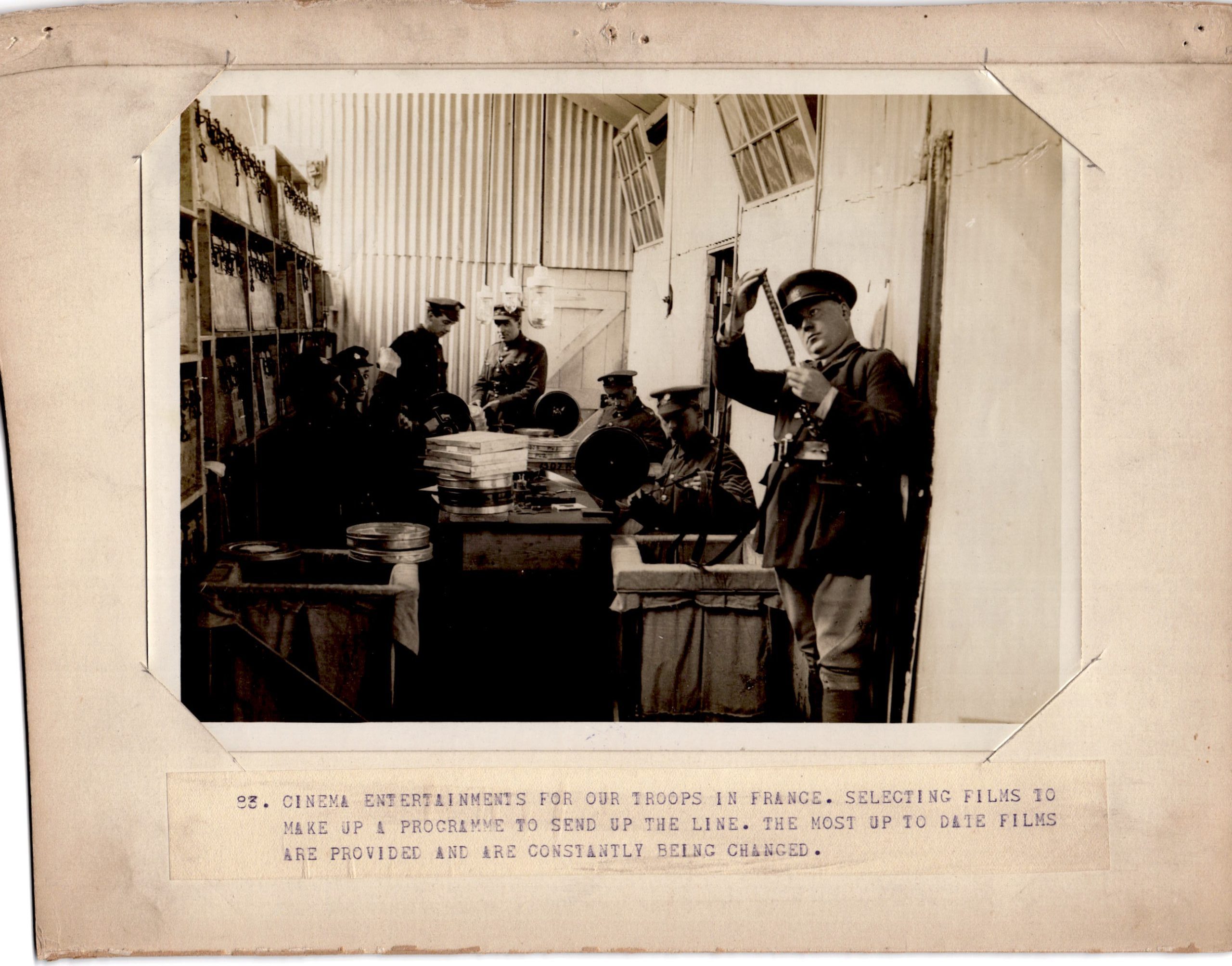 CINEMA ENTERTAINMENT FOR OUR TROOPS IN FRANCCE. SELECTING FILMS TO MAKE UP A PROGRAMME TO SEND UP THE LINE. THE MOST UP TO DATE FILMS ARE PROVIDED AND ARE CONSTANTLY BEING CHANGED.